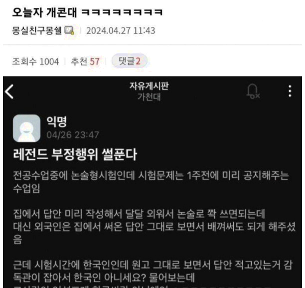 가천대 시험중 부정행위 레전드 썰 ㅋㅋ