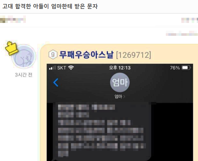 고대 합격한 아들이 엄마한테 받은 문자 레전드ㄷㄷ